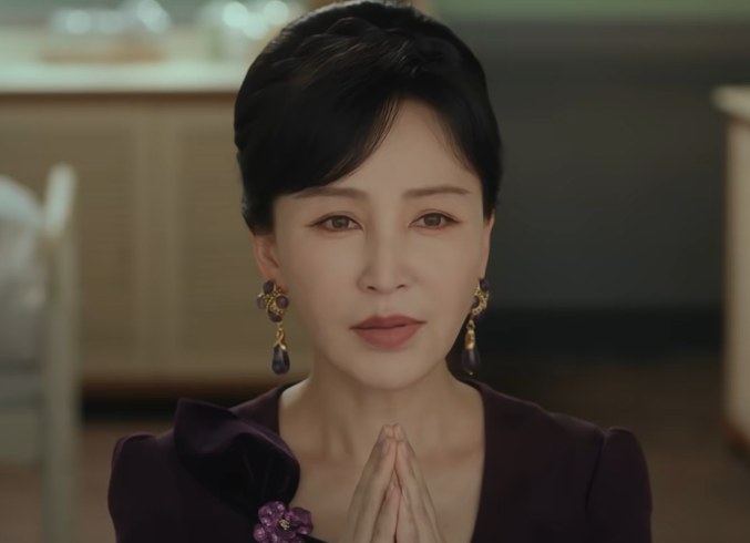 造型高贵优雅,豪门贵妇的气质溢出屏幕,双手合十似乎是在祈祷儿子出行平安,虔诚的目光满是担忧和无奈。